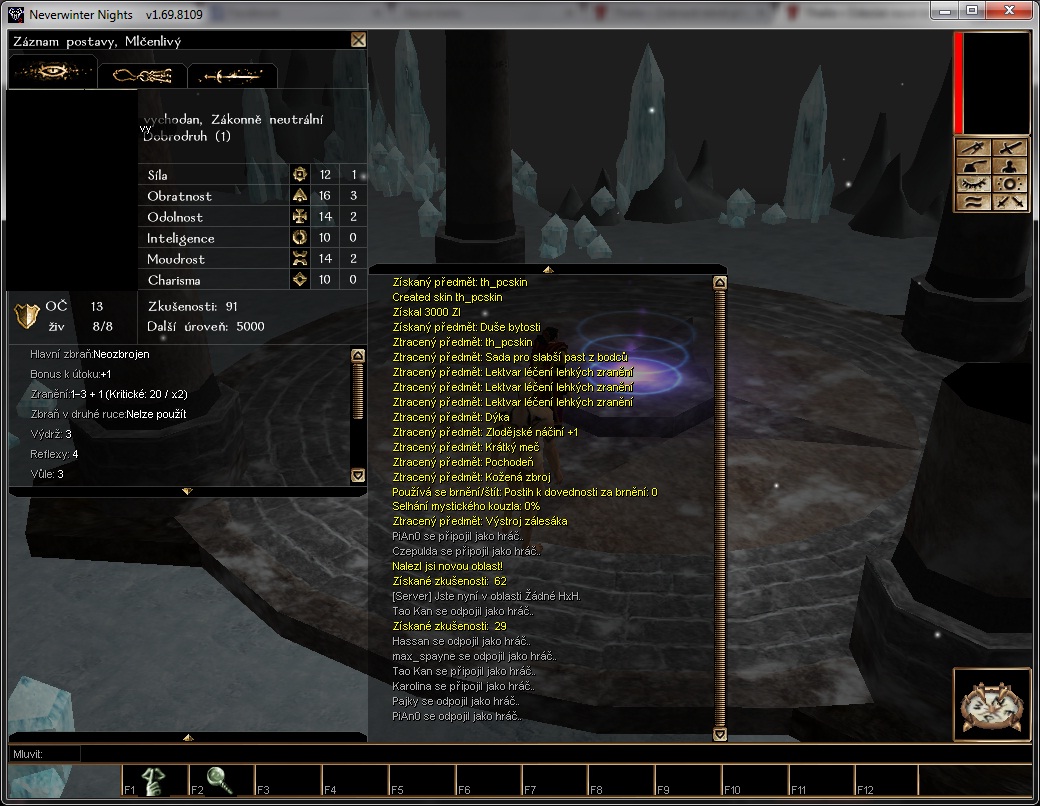 Při prvním lognutí mi chyběl hak, který jsem následně doplnil. Při logu postava umřela a sama se zvedla, ale nemůže se hýbat.