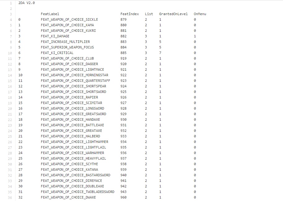 Prosím, mrkněte na to... J_F Myslíš feat Ki critical, který dostáváš na 10. levelu? Jak už psala karolina, tak nevidim falchion v možnostech pro weapon of choice, takže mi uplně neni jasný, jak bys ho tak mohl používat. Kdyžtak to ještě jednou zkontroluj v charakter sheetu. Apropo řekl bych, že správná tabulka je cls_feat_wm.2da a ne cls_feat_kensei.2da