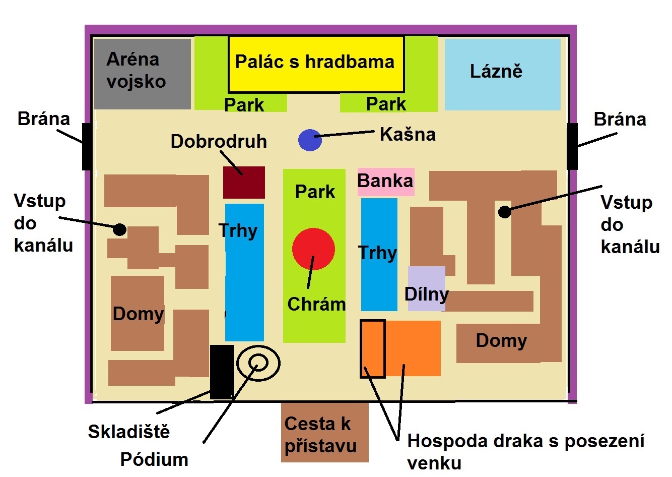 Kolem pak různé domy se zákoutími pro nelegální věcičky se vstupem do kanálů, kde by mohly být stanoviště pro učitele vrahů, heteriků, a tak dále. Taky by kanály mohly být cíl pro expení low lvlů 2-5lvl (krysy a spol)