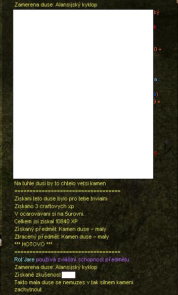 Necrooo wrote: monstera wrote: Istvan wrote: Kamen urcite nemizi, kdyz je duse prilis mala. S tim, ze te jednou bude stat ocarovani miliony pocitej, chytat duse s kamenama za 100k a 200K je velmi obtizne, a nez se to naucis je sance velmi mala dusi zachytit. Docela to ocarovani koumam, ale zasekl jsem se na nedostatku financi. Necrooo wrote: Aha, aha, ja jen zacinam. Budu si toho vsimat schvalne. A já byl první, kdo se do něj po zavedení pustil, ale zasek jsem se na tom, že jako kněžka mám nízkou inteligenci a tak mi přibývají zkušenosti po 1exp To sem se chtel prave zeptat. Jak to ovlivnuje modifikator inteligence? Ovlivnuje zisk expu nebo zda se mi to povede? S moji inteligenci 30/+10 nevim co cekat  počítá se jen základ bez předmětů a faetů, nad 13 je to v pohodě, mých 10 je katastrofa