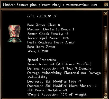Byly vyrobeny stínové boty v poměru 200% s velmistrovskou kůží a dávají pouze +3AC... a přilba která byla vyrobena stejně dává normálně +4AC.