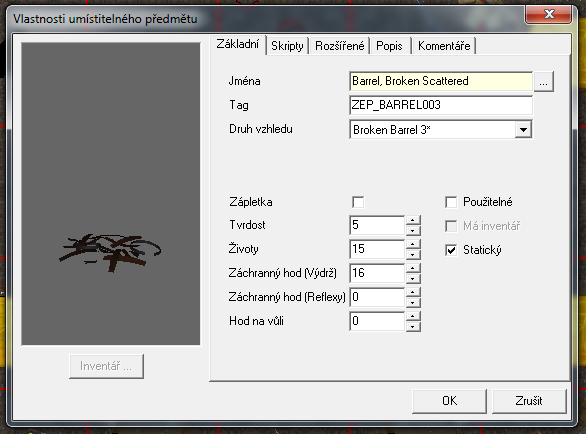 3) Má inventář - Pokud zaškrtnete, placeabl bude mít inventář. U nezamčených kontejnerů se nastavuje ještě zápletka, aby nešly rozbít. Pozor! U kontejnerů v přátelských oblastech, které mají fungovat jako kontejner, je třeba smazat všechny skripty.